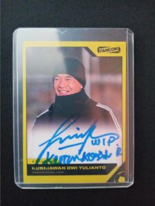 Bapak Kurniawan Dwi Yulianto, yang dikenal sebagai “Indonesian Football Legend,” hadir dalam sesi FANCONNECT untuk meet & greet dan sesi tanda tangan. Salah satu gambar eksklusif menunjukkan momen berharga berupa kartu koleksi resminya bertuliskan FANCON yang sudah dibubuhi tanda tangan biru asli beliau. Koleksi ini dipastikan menjadi buruan para kolektor, terutama para pecinta sepak bola nasional. Selain Kurniawan Dwi Yulianto, acara ini juga diramaikan oleh bintang-bintang olahraga lain seperti Shafira Ika Putri, Muhammad Ferarri, Zahra Muzdalifah, dan Yolla Yuliana, serta tokoh fandom lainnya seperti Iwa K dan Danilla.